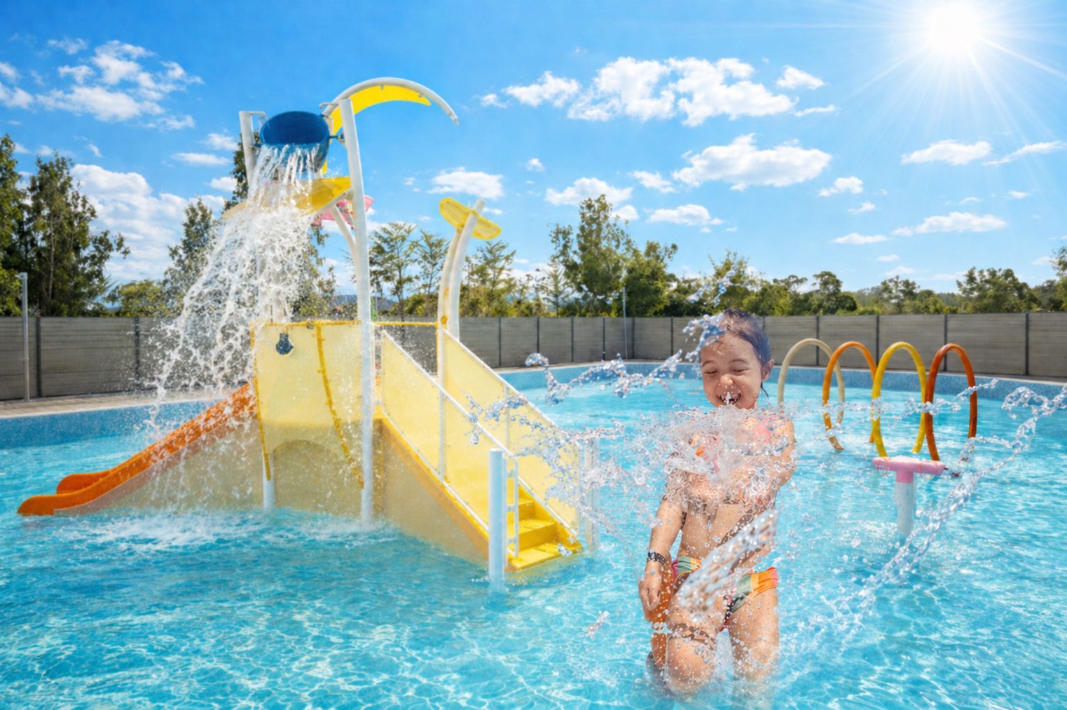 我們將各種瘋狂有趣的互動噴水機關、迷你水桶與色彩繽紛的小型滑梯,巧妙結合在安全的淺水區中。